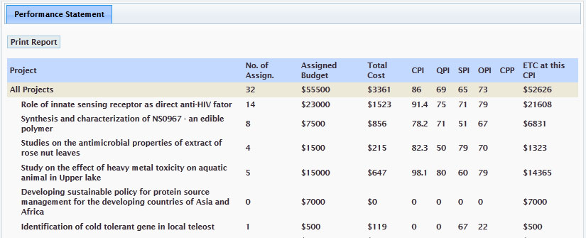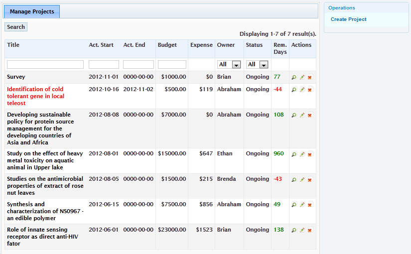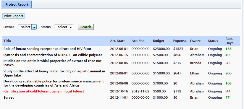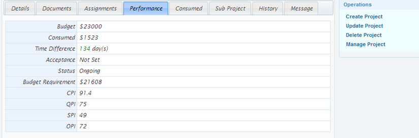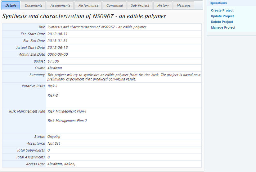 Check specific detail of a project at any time. You will find the objectives, budget, owner, other persons given access to see relevant info, putative risks, risk management plan, consumed cost, start date, end date etc of a project.